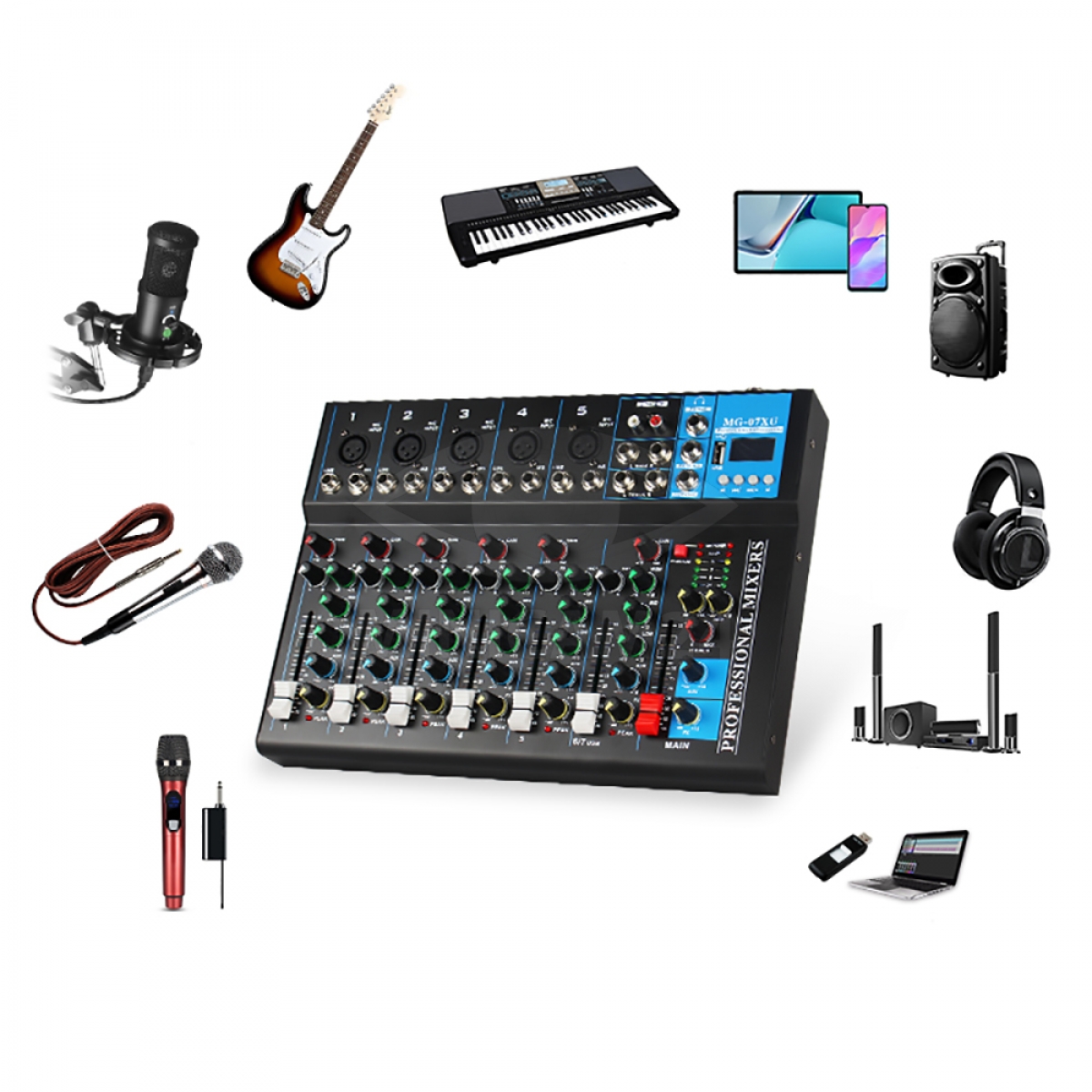Микшерный пульт 7-ми канальный J.I.Y MG-07XU цифровой подойдет для микрофона, для вокала, для компьютера, для колонок как в условиях студии, так и дома. Звуковой домашний беспроводной микшер громкости с блютузом имеет удобную панель управления с поворотными регуляторами, на которых установлены прорезиненные накладки. Музыкальный микрофонный bluetooth стерео микшер для звука оснащен микрофонными входами, которые защищены от помех и возможных искажений. Всего в аудиомикшере предусмотрено 6 моновходов и 1 стереовход. На каналы подается мощность 48 Вт. Микшерный пульт может использоваться как с микрофонами проводными и беспроводными, так и с телефонами, планшетами и другими устройствами при соединении по блютуз.