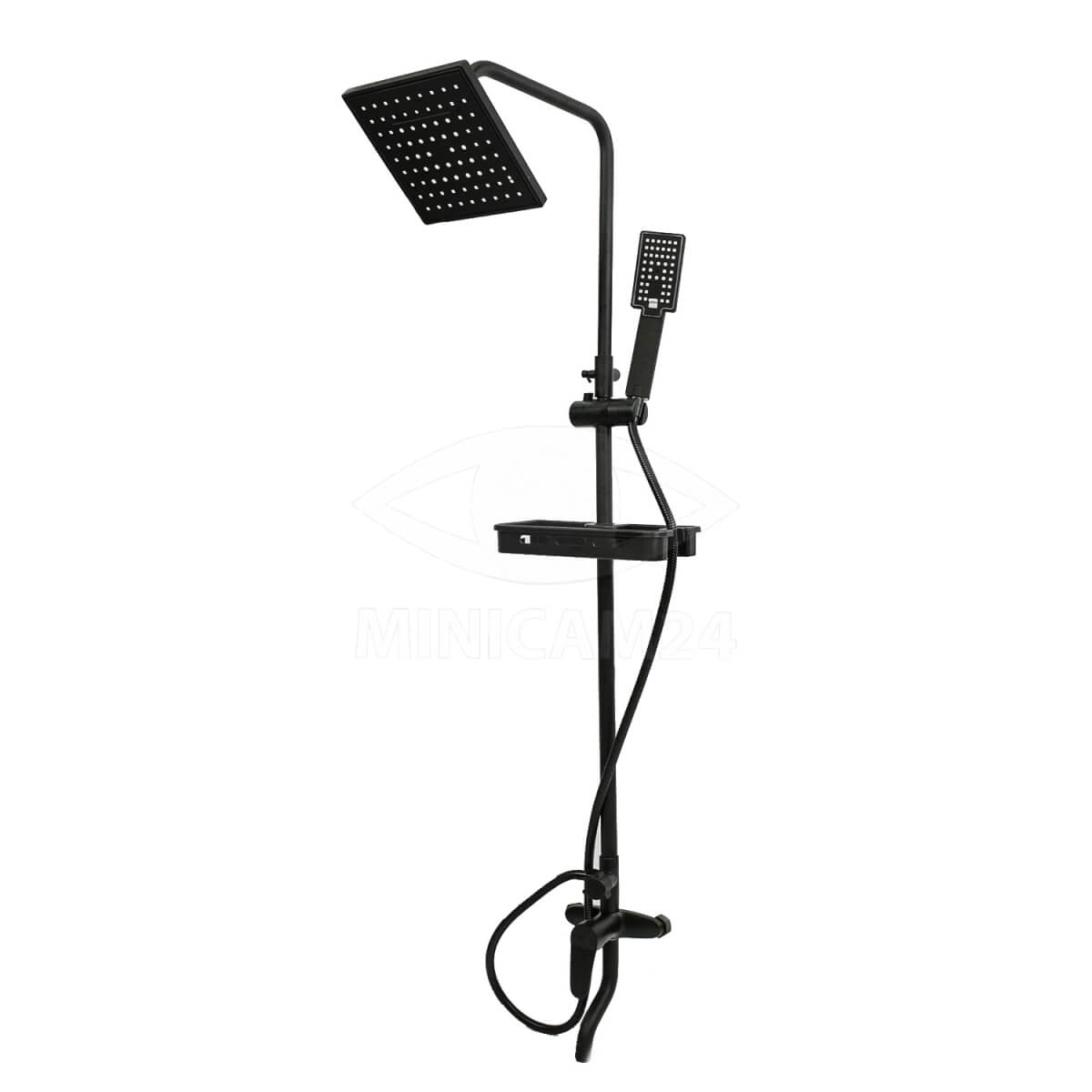 Душевой комплект с тропическим душем Quadro черный матовый предназначен для ванной или для душевой кабины в квартире или частном доме. Система тропический душ монтируется на стену и выглядит как металлическая стойка с матовым покрытием, оснащенная небольшим пластиковым контейнером для шампуней, мыла, мочалки и других предметов. Высота лейки достигает 225 мм. Верхний душ имеет квадратную форму и оснащен регулятором струи в трех режимах, при которых вода распыляется по-разному. Смеситель с изливом поворотным управляется рычажным способом. В комплект входят душевая система, штанга, пластиковая емкость и крепежные элементы.